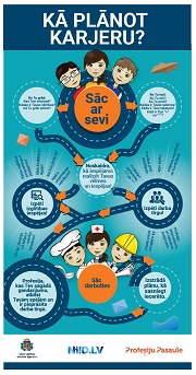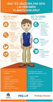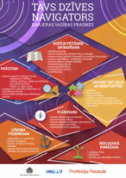 Katra infografika sniedz atbildi uz kādu no svarīgiem dzīves jautājumiem: sevis izpēte un karjeras plānošana, izglītības ieguve, profesijas izzināšana, palīgi karjeras atbalstam. Infografikas vari aplūkot kā PDF failus, lejupielādēt savā datorā vai mobilajā ierīcē un izdrukāt.